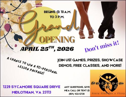 Welcome to Virginia Beach! Weekend of workshops, dance parties and the annual Virginia Beach Dance Challenge - the premier Ballroom Dance Competition in Hampton Roads. The Virginia Beach Dance Challenge is held at the DanceSportVA studio. 5721 Arrowhead Drive, Virginia Beach, VA, In this 7,500 square foot facility are men's and women's dressing rooms, practice and warm up floor in the dance club and the competition in the main ballroom. PRO-AM & AM/AM WELCOME! Friday, May 16: Welcome Party and Latin night 9pm: Jack and Jill Salsa & Bachata completion Saturday May 17 Competition day Country & West Coast social after dinner 9pm: Jack & Jill WCS & Country Two-Step comps Visit the 2025 VBDC page at the link above for competition information, schedule of events, hotel information, our slate of officials and much more! (Item Posted Wednesday, May 14, 2025 at 12:35)
