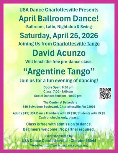At The Center at Belvedere 540 Belvedere Boulevard, Charlottesville, VA Doors open at 6:30pm for Registration (CASH or CHECKS only, please) Dance class: 7 - 8pm, Edwin Roa and Linda Buechel teaching Salsa Social dance: 8- 10pm Dancing to a wide(!) variety of dance music No partner required Admission $10, Students with ID $5, Dance Teachers - Free! *** CASH or CHECKS only, please. Light refreshments provided. No smoking or alcohol. Great(!) dance floor. Easy, free parking. Friendly folks! Smart casual to dressy attire. Soft-soled shoes please Facebook (Item Posted Tuesday, May 06, 2025 at 11:25)