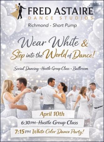 Each social highlights a different dance; try them all! $20, Member, $15 We welcome those with "two left feet!" The 7:00pm Beginner and Intermediate lessons Social Dancing, Ballroom, Latin & Swing Music open dancing until around 10:00pm. Practice what you've learned, mingle, snack, get some exercise and have fun! No partner required. Light refreshments provided. Please arrive 15 minutes early to sign in and warm up! We recommend shoes with leather soles and layers - we start chilly but warm up fast! Shoes, jackets, and other merchandise are available for purchase! 125 Olde Greenwich Dr Suite 190, Fredericksburg, VA 22408 (Item Posted Thursday, February 02, 2023 at 20:11) Back to MENU