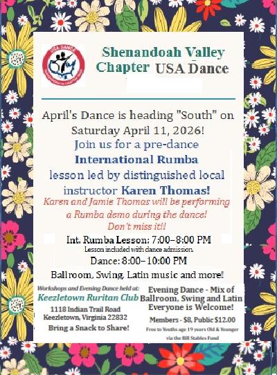 RSVP on Facebook for the Dinner & Dance There is NO COST to Members or to the Public for this event 6pm Dinner Catered by Karen Thomas and Kevin Castle 7pm Argentine Tango Lesson by Adriel Byrd 8-10pm Social Dance Showcase Dance by USA Dance Competitors David and Connie Taylor So we know how much food to make, RSVP or REGISTER NOW! See FB flyer for more details on how to register. at the Keezletown Ruritan Hall. 1118 Indian Trail Rd. Keezletown, VA (Item Posted Monday, January 26, 2026 at 23:40)