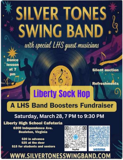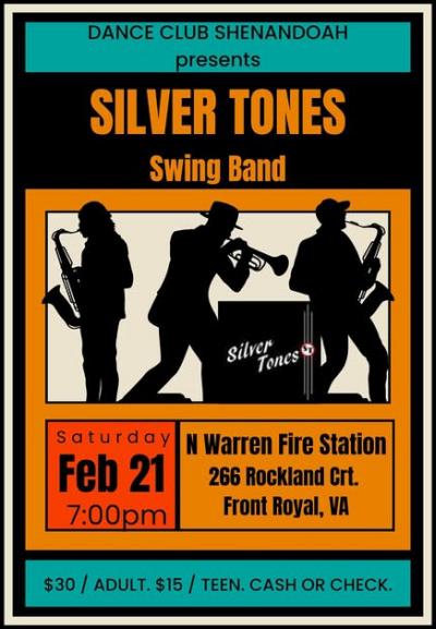 Join the Silver Tones Swing Band, Wendy Marie, Gene Bates, and the Silver Belles to celebrate L-O-V-E in style! at the Warrenton Community Center 430 E Shirley Ave, Warrenton, VA 20186-3725 The band will be playing two long sets, and audience seating for those who wish to just enjoy the music and watch the dancing. (Sweethearts are not required, but ...) 6:30 pm Dance instructors Valerie Pyle and Joe Manning will begin the evening with a refresher/beginner swing dance Lesson to get everyone ready to swing to the big band sound of the Silver Tones! The large dance-floor surface is a polished tile floor. Bottled water will be available for sale, and there will be a 50/50 raffle! Make a free song dedication to someone special and have your dedication read in front of the audience. Admission is $19.50 in advance and $25 at the door. All students and seniors (65+) are $15 at the door. Children 5 and under are free PURCHASE TICKETS ON LINE-HERE (Item Posted Tuesday, February 04, 2025 at 23:51)