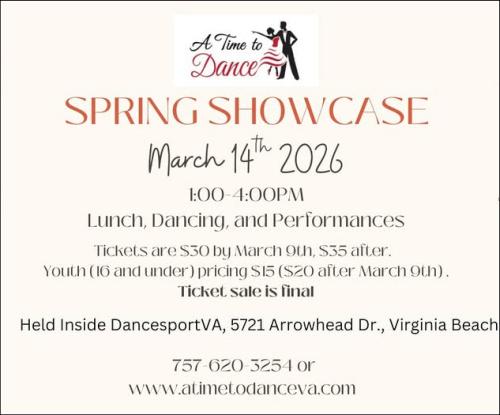 DanceSportVA: https://www.dancesportva.com/Facebookinfo@dancesportva.com 757-473-3267 Ballroom Dance Instruction, Locally hosted practice sessions, dance parties, events, showcases and competitions 5721 Arrowhead Dr, Virginia Beach, VA 23462