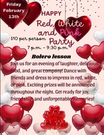 Theme & Attire: Valentine's Day, how about red, purple, pink or your own choice of Valentine colors. at the American Legion 710 Apperson Dr., Salem 3-6 pm $15 For reservations, call or text: 540-314-5477 or 540-314-3836 or email us at info@dancingduo.net. Cash, card or check payable to Dave & Donna Spangler. Pay at the door. If hosting a table, please let us know the names of all at your table. Single's table available. DJ music by Matt Swift. Water & desserts provided. You may bring snacks to share or for your table. ALCOHOL-FREE dance. (Item Posted Sunday, January 05, 2025 at 14:01)