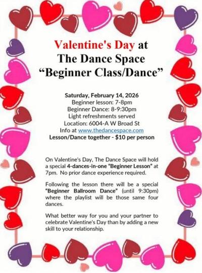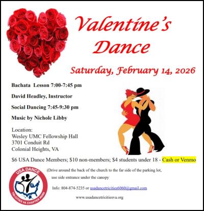 at the Wesley UMC Fellowship Hall 3701 Conduit Rd, Colonial Heights. VA 7:00-7:45 Roger Underhill and his wife Denise teaching a swing combo. 7:45-9:30 Social Dancing to a Variety of Music, DJ Jerry Scaglione Dress is "Valentine's dressy casual" Please bring a snack to share $10, $6 USA Dance Members $4 Students under 18 with school ID Drive around the back of the church to the far side of the parking lot. Use side entrance under the canopy (Item Posted Thursday, January 30, 2025 at 11:54)
