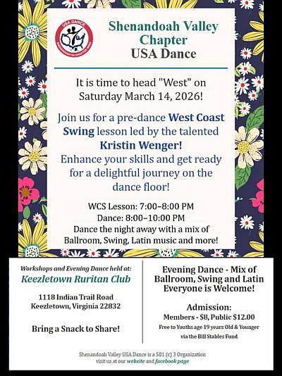 RSVP on Facebook for the Dinner & Dance There is NO COST to Members or to the Public for this event 6pm Dinner Catered by Karen Thomas and Kevin Castle 7pm Argentine Tango Lesson by Adriel Byrd 8-10pm Social Dance Showcase Dance by USA Dance Competitors David and Connie Taylor So we know how much food to make, RSVP or REGISTER NOW! See FB flyer for more details on how to register. at the Keezletown Ruritan Hall. 1118 Indian Trail Rd. Keezletown, VA (Item Posted Monday, January 26, 2026 at 23:40)