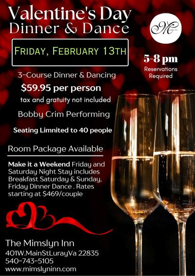 Create lasting memories with your special someone with our enchanting Valentine’s Weekend offerings are designed to make your celebration of love truly exceptional. Reserve your spot now and embark on a journey of romance and indulgence. Join us for a romantic evening in Circa ’31. Enjoy an exquisite 3-course dinner with reservations available from 5 PM to 8 PM, followed by dancing with music by Robbie Limon (Friday) and Nikki & Ryan Dovel (Saturday) Whether you’re planning a cozy dinner or an unforgettable getaway, we have something special for you. Dinner Reservations Required. Dinner Only Reservations $55.00 pp ++. Stay with us and take advantage of our Room Package including Dinner for Two To ensure your spot at one of the Dinner Dances, it is recommended to reserve your table early, as seating is limited. 401 W. Main Street, Luray, VA 22835 (Item Posted Wednesday, January 31, 2025 at 00:57)